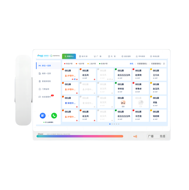 創(chuàng)新設(shè)置在護(hù)士站,可壁掛也可直接放在桌面上。主要接聽(tīng)病區(qū)內(nèi)病床分機(jī)的呼叫以及患者信息查詢、廣播等基礎(chǔ)應(yīng)用功能,減輕醫(yī)護(hù)人員來(lái)回跑動(dòng)的無(wú)效勞動(dòng)和壓力,及時(shí)響應(yīng)患者需求,并做好醫(yī)護(hù)信息管理。軟件參數(shù):1)采用多點(diǎn)觸控電容顯示屏操作。每個(gè)觸摸按鈕可以顯示整個(gè)病區(qū)下的,所有病人的名字、性別、護(hù)理等級(jí),點(diǎn)擊格子后,可顯示每張病床患者更具體的患者信息。2)基于TCP/IP網(wǎng)