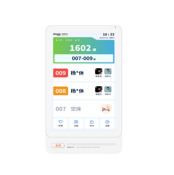 設(shè)置在病房門口的終端設(shè)備,主要用于顯示病房相關(guān)信息,內(nèi)置簡(jiǎn)易醫(yī)護(hù)工作站,支持病房床位一覽、患者動(dòng)態(tài)跟蹤、呼叫對(duì)講、增援求救等多種呼叫類型,信息齊全,及時(shí)響應(yīng)醫(yī)護(hù)需求,實(shí)現(xiàn)智能化醫(yī)護(hù)管理。
