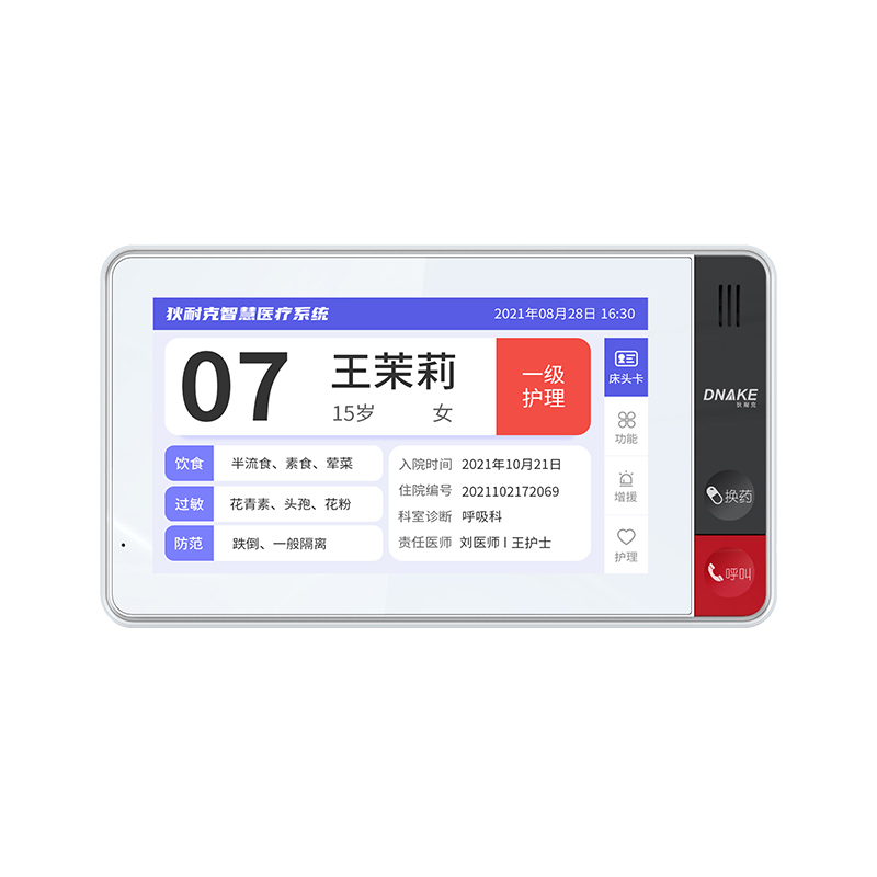 安裝在病床頭的交互設(shè)備機,代替?zhèn)鹘y(tǒng)紙質(zhì)卡。產(chǎn)品支持呼叫對講、為住院患者提供病例查詢、狀態(tài)自動提醒等護(hù)理需求等。