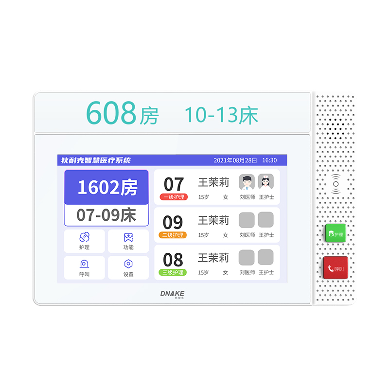 設(shè)置在病房門口的終端設(shè)備,主要用于顯示病房相關(guān)信息,內(nèi)置簡易醫(yī)護工作站,支持病房床位一覽、患者動態(tài)跟蹤、呼叫對講、增援求救等多種呼叫類型,信息齊全,及時響應(yīng)醫(yī)護需求,實現(xiàn)智能化醫(yī)護管理。